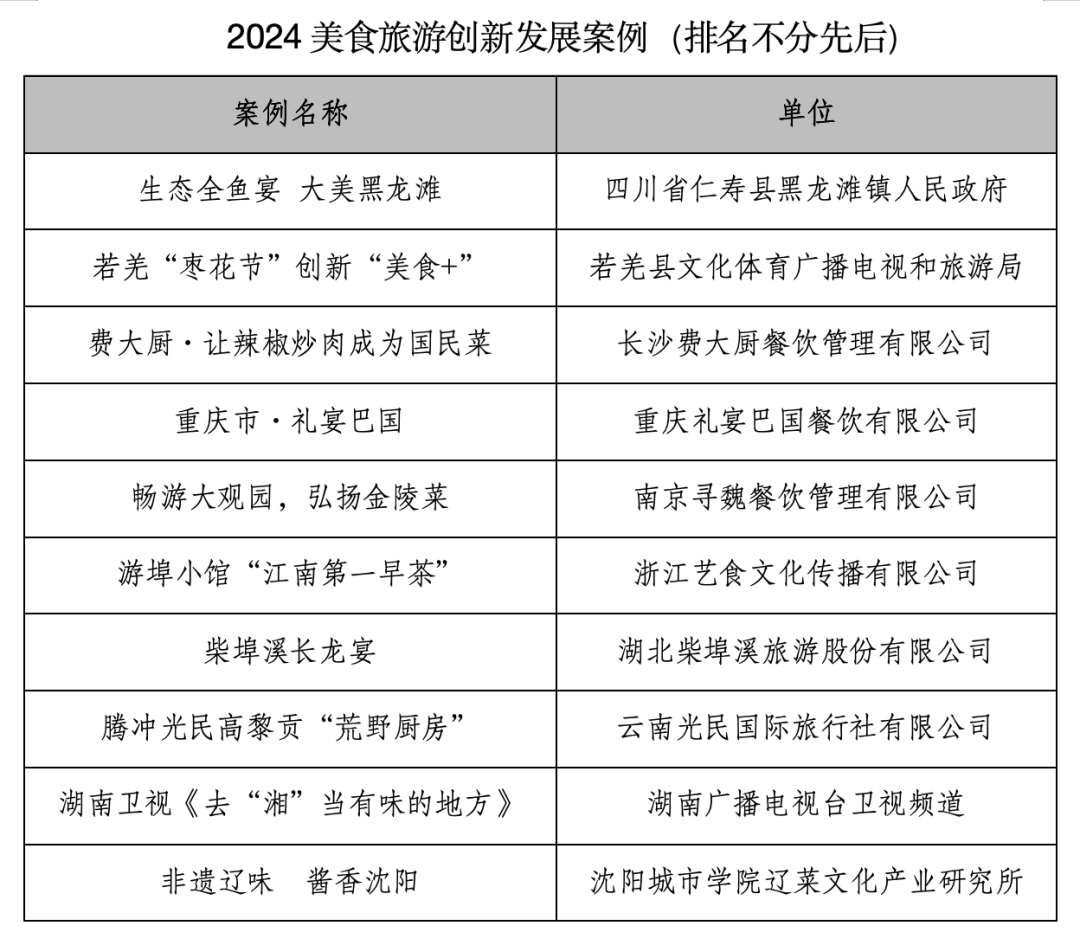 On September 21, the "2024 Food Tourism Development Conference" was held in Hengyang, Hunan, jointly sponsored by the China Tourism Research Institute, the Hunan Provincial Department of Culture and Tourism, the CPC Hengyang Municipal Committee, and the Hengyang Municipal People's Government, hosted by the Hunan Provincial Tourism Association, the Hengyang Municipal Bureau of Culture, Tourism, Radio, Film and Television, and Sports, and the Hengyang Municipal Bureau of Commerce, and supported by the World Federation of Chinese Restaurants. The conference released the list of "2024 Food Tourism Integration Development Cases" and "2024 Food Tourism Innovation Development Cases". 1. 2024 Food Tourism Integration Development Cases [Honors] Chinese cuisine, coming from the vast history of 5,000 years, absorbs the essence of humanities, breeds ups and downs, brightens the Chinese table, and strengthens the Chinese body. When the wheel of food runs on the track of mass tourism, everything becomes clear, and a series of footprints in search of food paint a picture of a better life. A bowl of flavor evokes a local accent, a dish evokes the memory of a city, a thought supports a century-old heritage of a signboard, and a story can catalyze the dazzling light of flavor... From the government to enterprises, from colleges to kitchens, chefs, store managers, and managers, countless hands push food and tourism on the road of integration, going further and further.